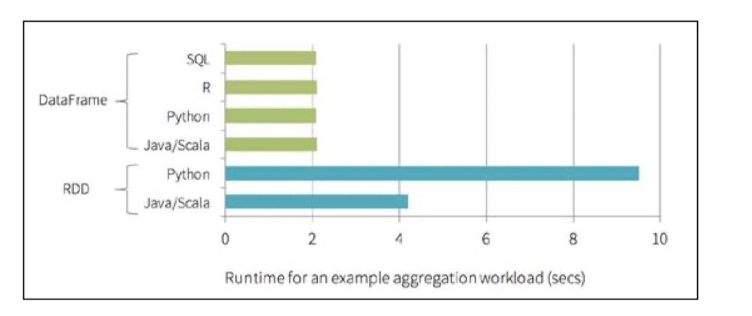 而现在有了Catalyst优化器之后,会自动帮助我们进行底层的计算优化。并且即使是非原生的Python语言,也可以使用它,因此会带来性能的极大提升。甚至经过官方的测量,使用pyspark写DataFrame的效率已经和scala和java平起平坐了。