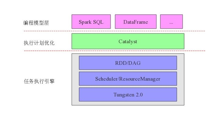 整个SparkSQL的模型大概分为三层,最上面是编程模型层,中间是执行优化层,最后是任务执行引擎。