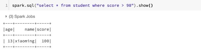 我们通过spark.sql传入一段SQL string即可完成数据的调用,需要注意的是,DataFrame也支持RDD的collect或者take等方法。如果这里的结果我们调用的是collect,那么spark会将所有数据都返回。如果数据集很大的情况下可能会出现问题,所以要注意show和collect的使用范围和区别,在一些场景下搞错了会很危险。