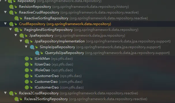 在客户的案例中,我们发现在自定义的CustomerDao中,并没有提供任何方法就可以使用其中的很多方法,那么这些方法究竟是怎么来的呢?答案很简单,对于我们自定义的Dao接口,由于继承了JpaRepository和JpaSpecificationExecutor,所以我们可以使用这两个接口的所有方法。