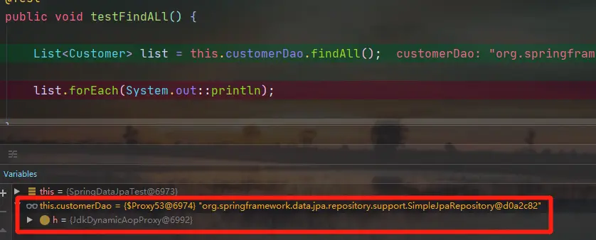 当程序执行的时候,会通过JdkDynamicAopProxy的invoke方法,对customerDao对象生成动态代理对象。根据对Spring Data JPA介绍而知,要想进行findAll查询方法,最终还是会出现JPA规范的API完成操作,那么这些底层代码存在于何处呢?答案很简单,都隐藏在通过JdkDynamicAopProxy生成的动态代理对象当中,而这个动态代理对象就是SimpleJpaRepository