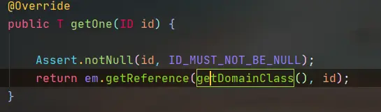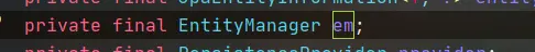 通过SimpleJpaRepository的源码分析,定位到了getOne方法,在此方法中,返回em.find()的返回结果,那么em又是什么呢?
