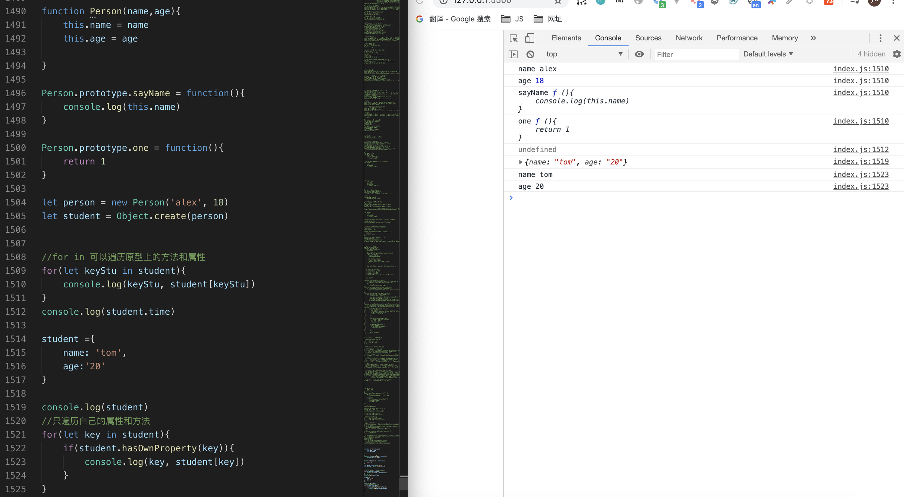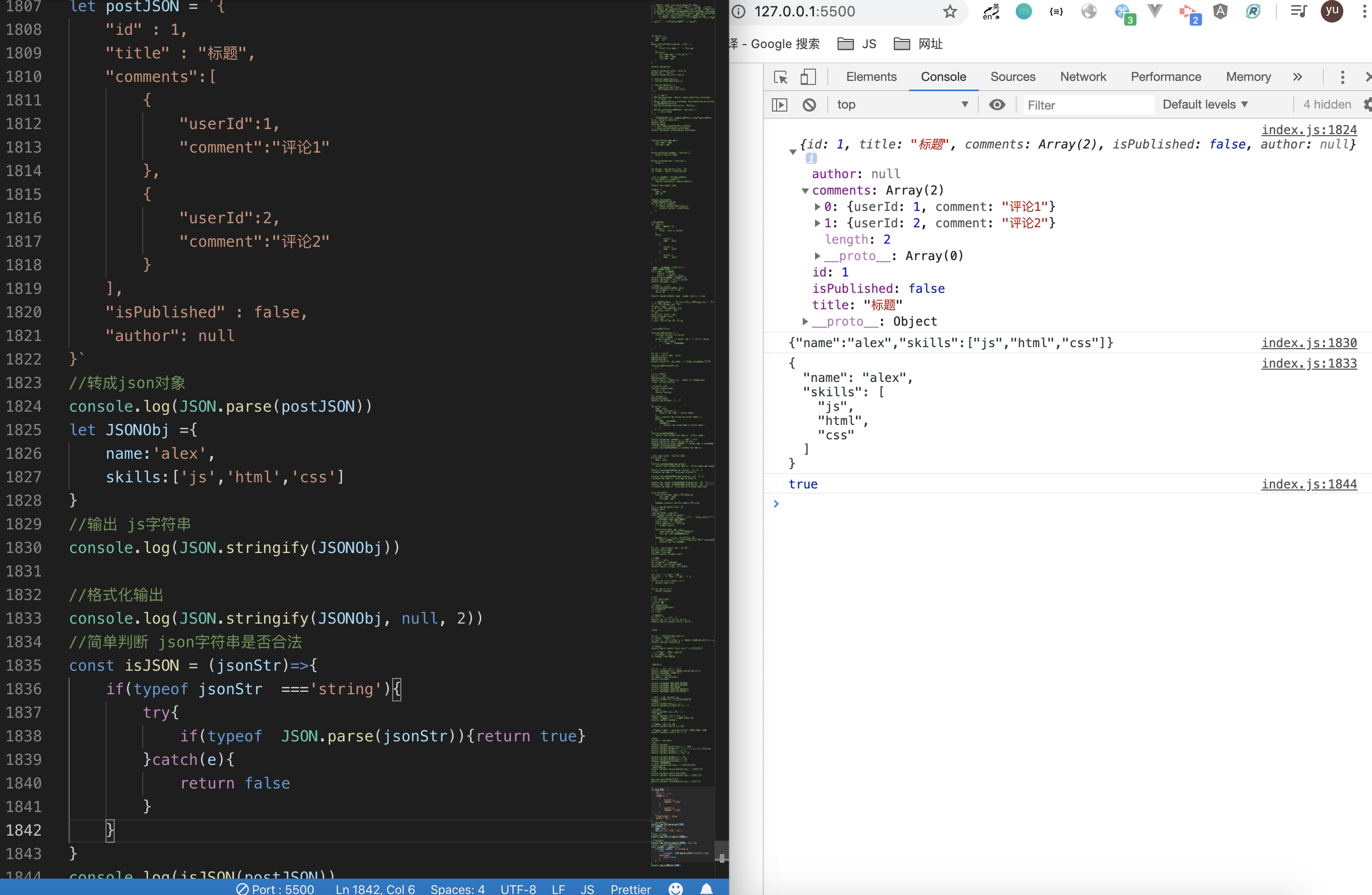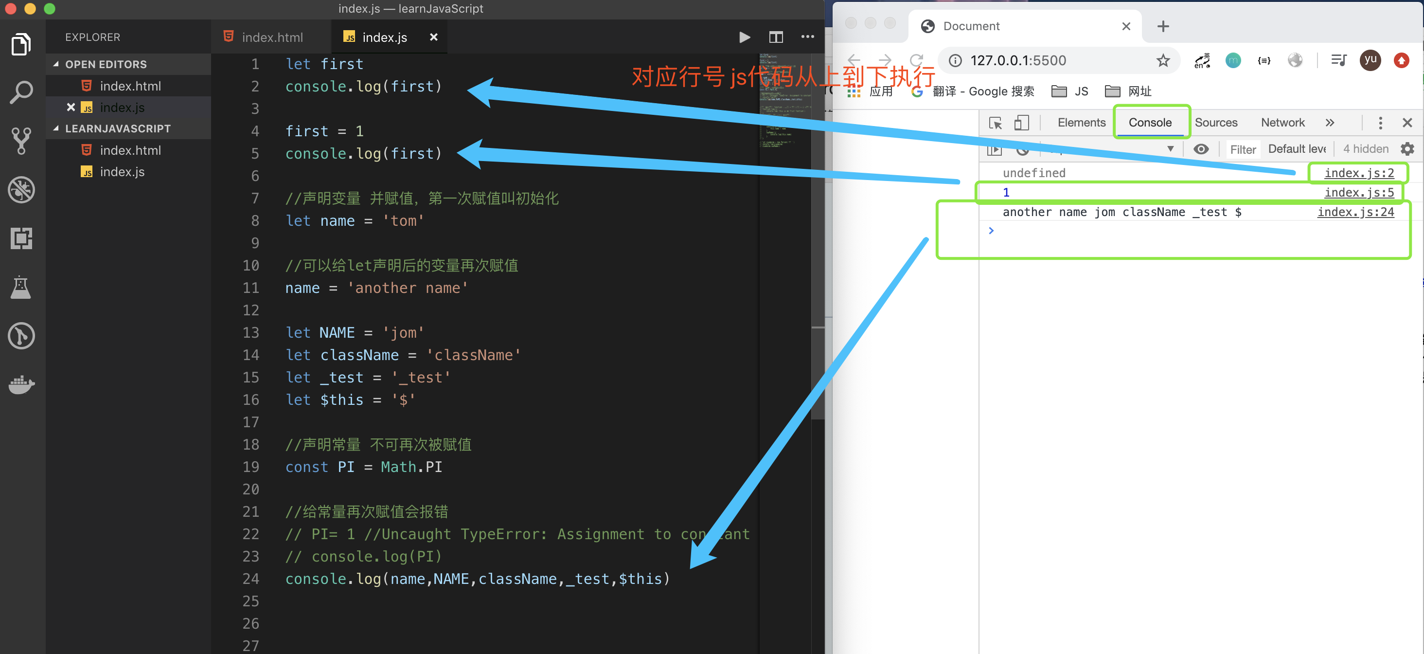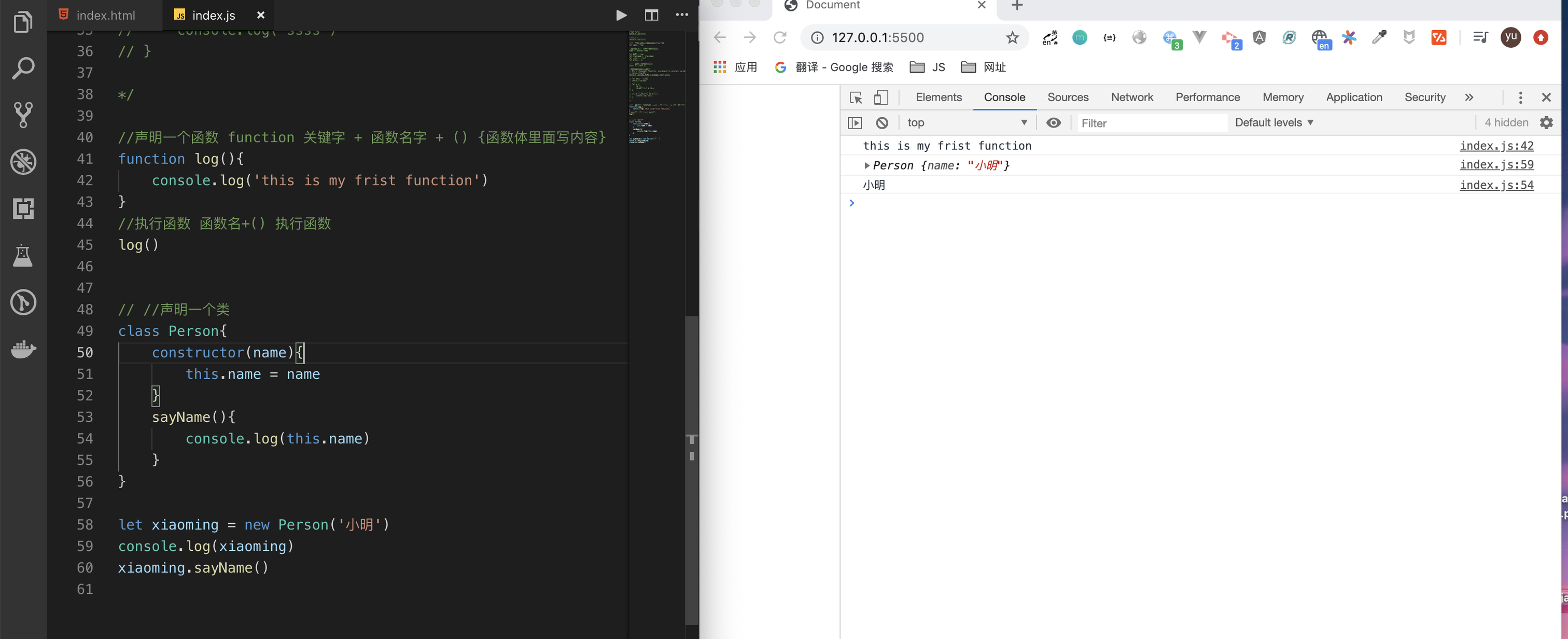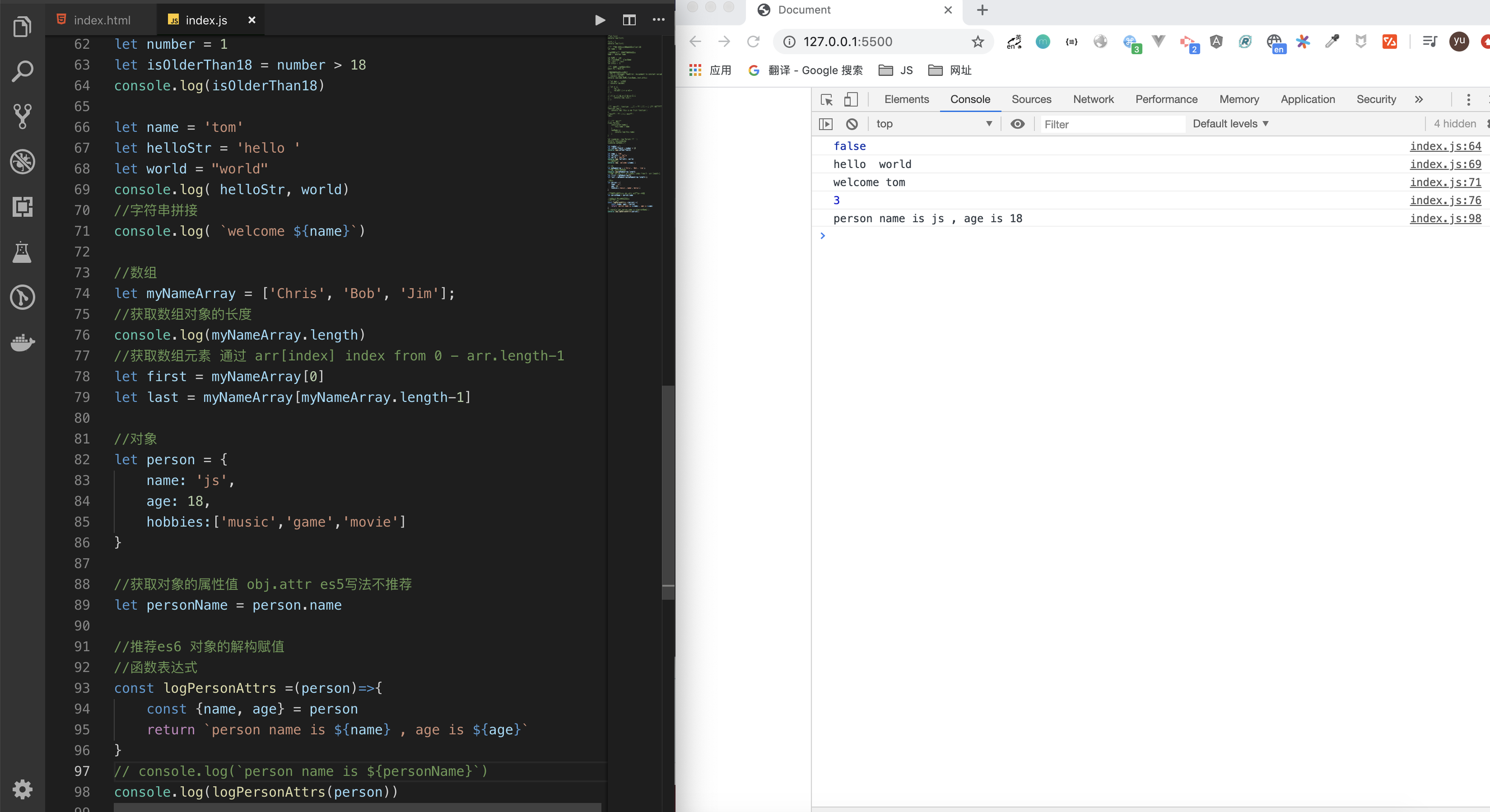 接下来我们就在index.js里面输入新的学到的语法,保存以后,借助live server插件在浏览器里面验证结果