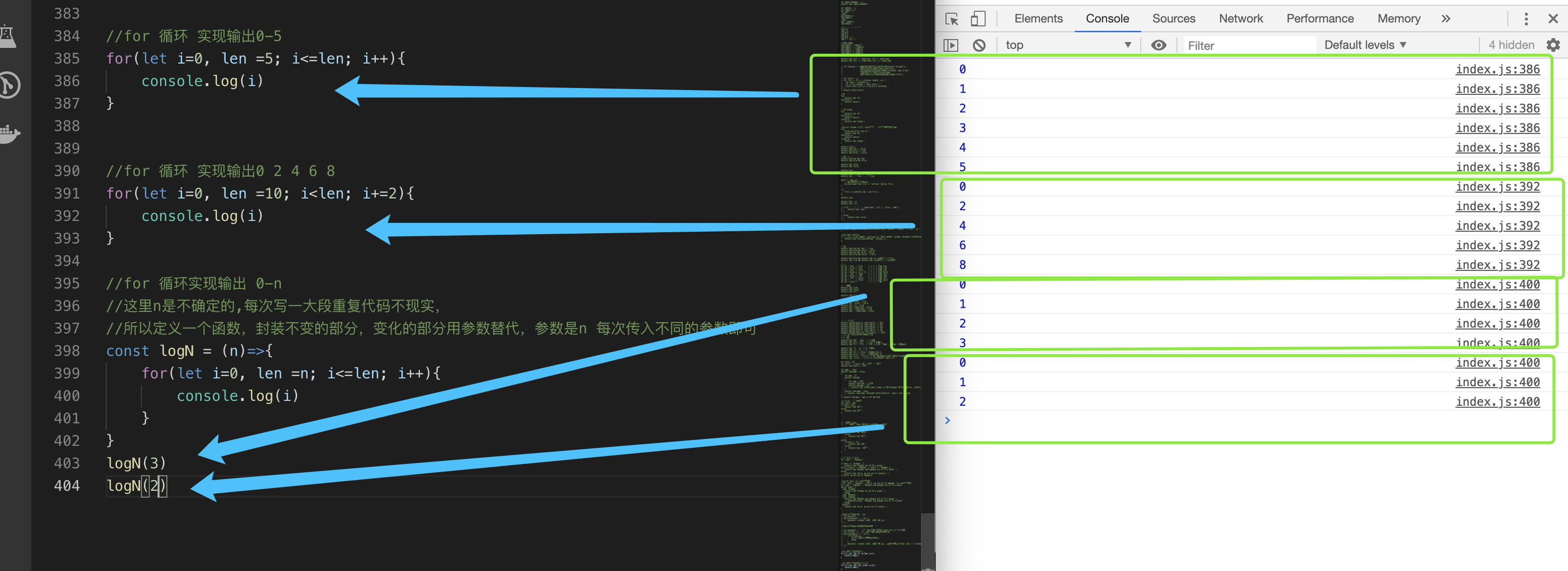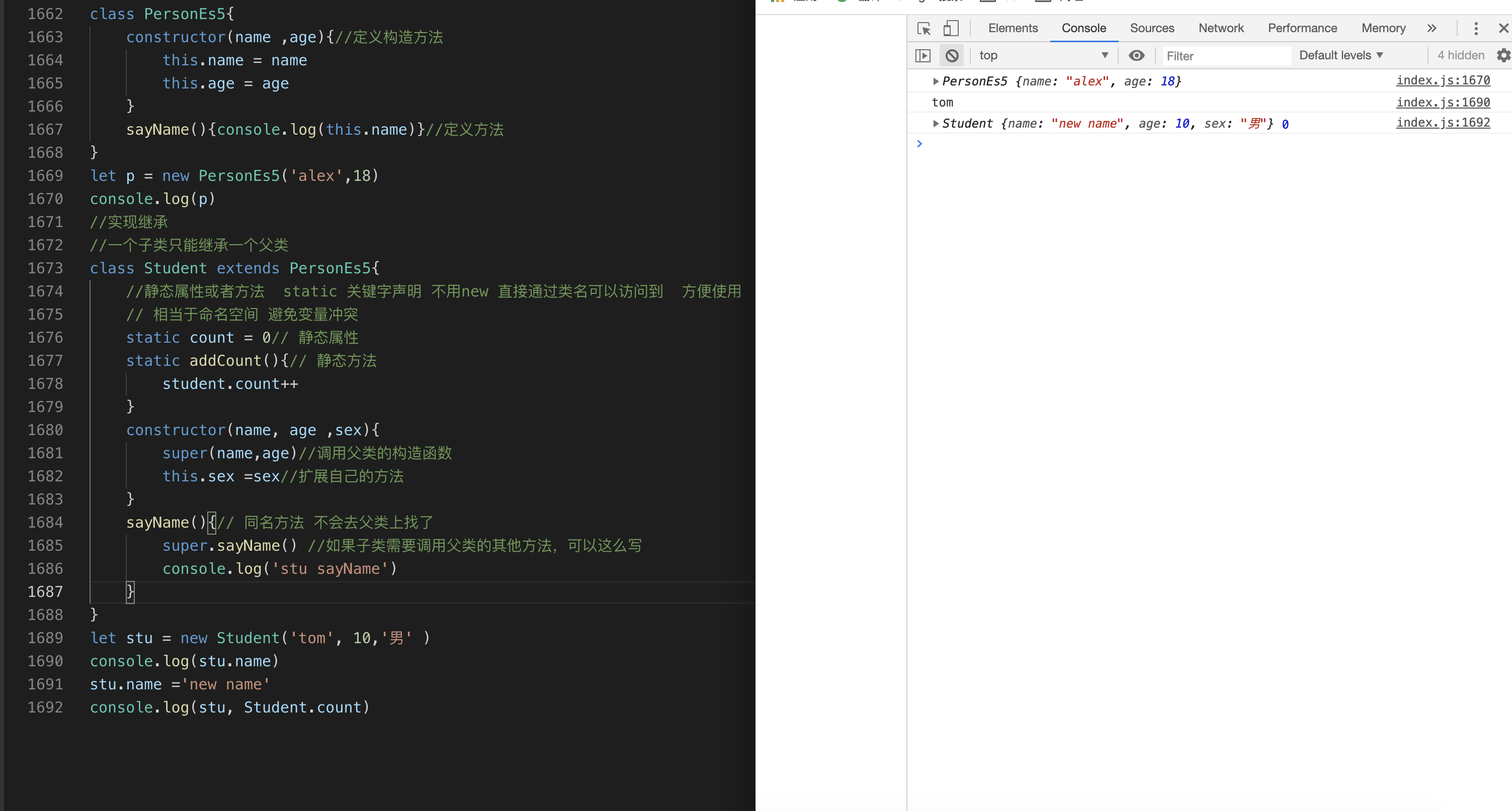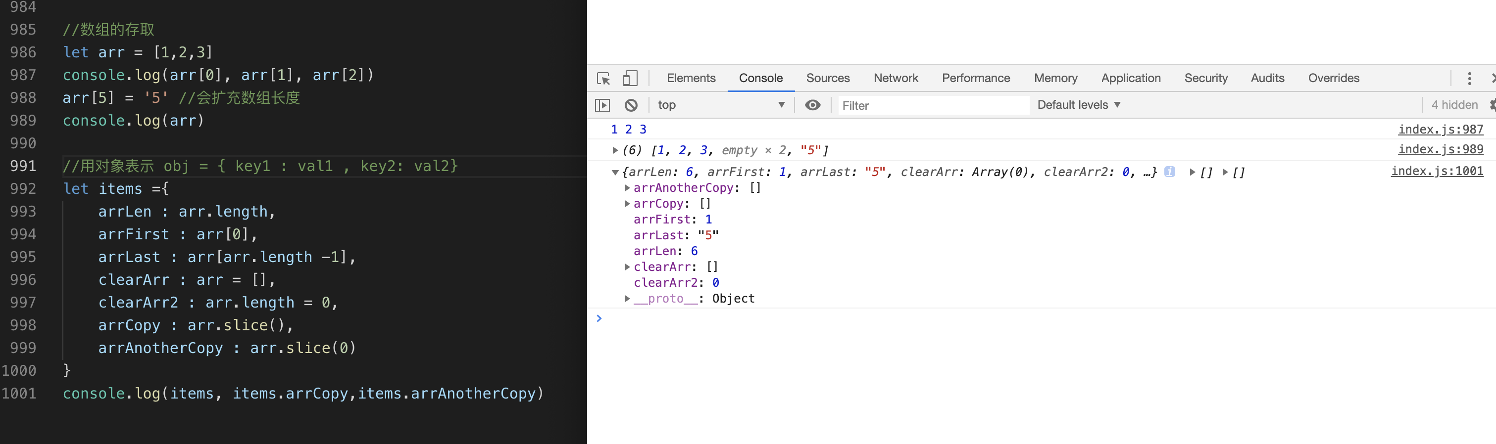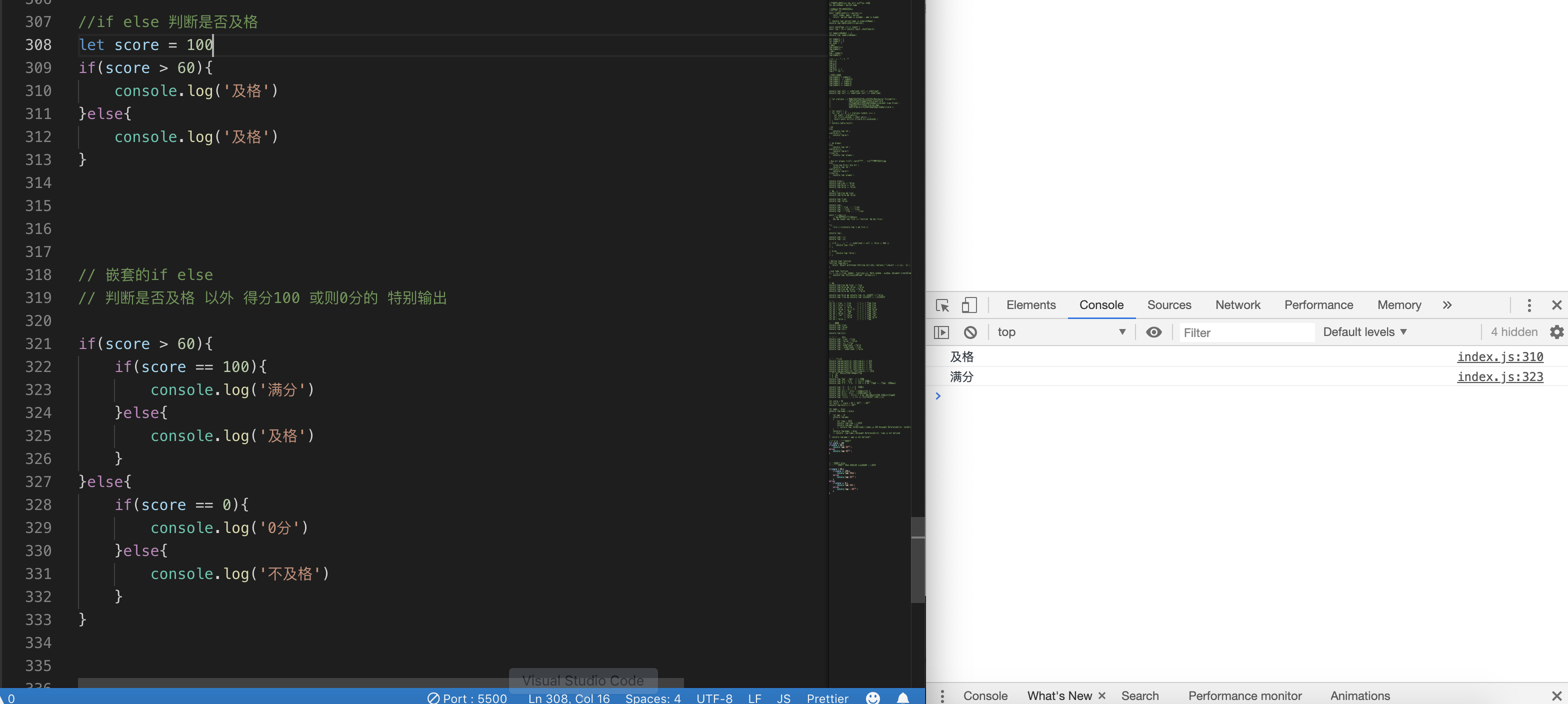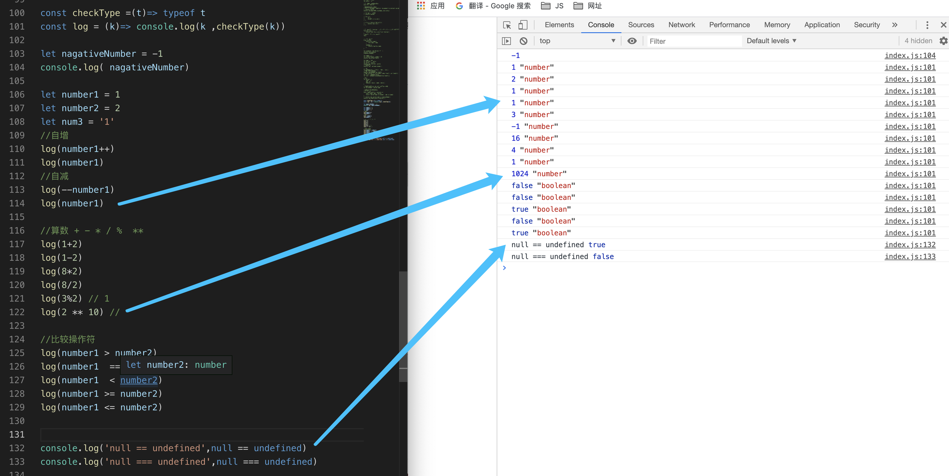 接下来我们就在index.js里面输入新的学到的语法,保存以后,借助live server插件在浏览器里面验证结果