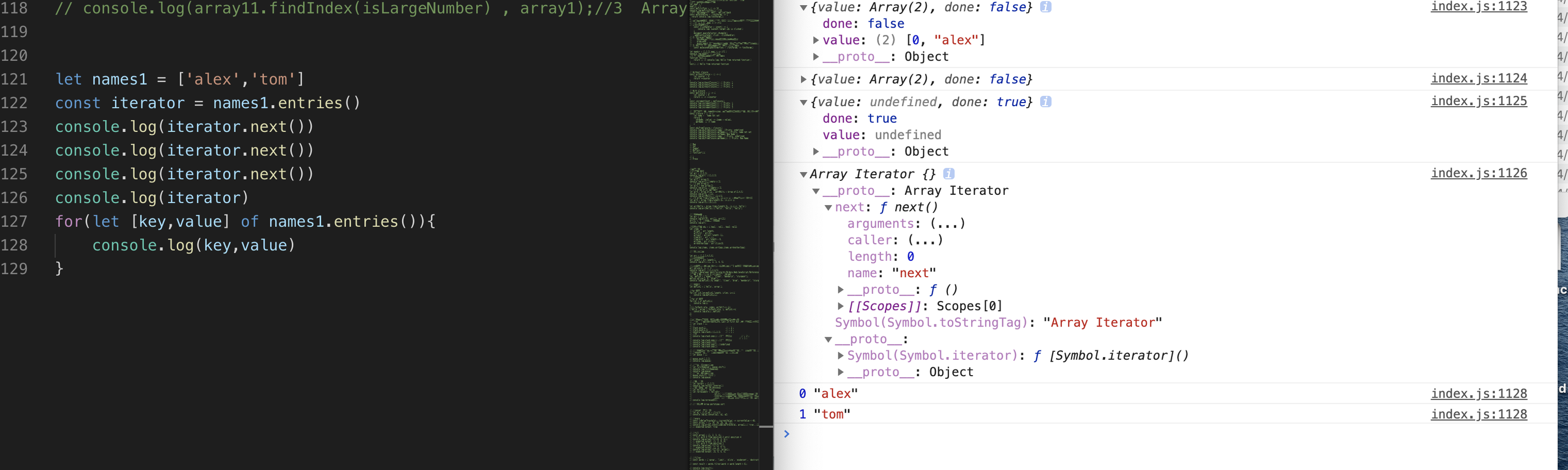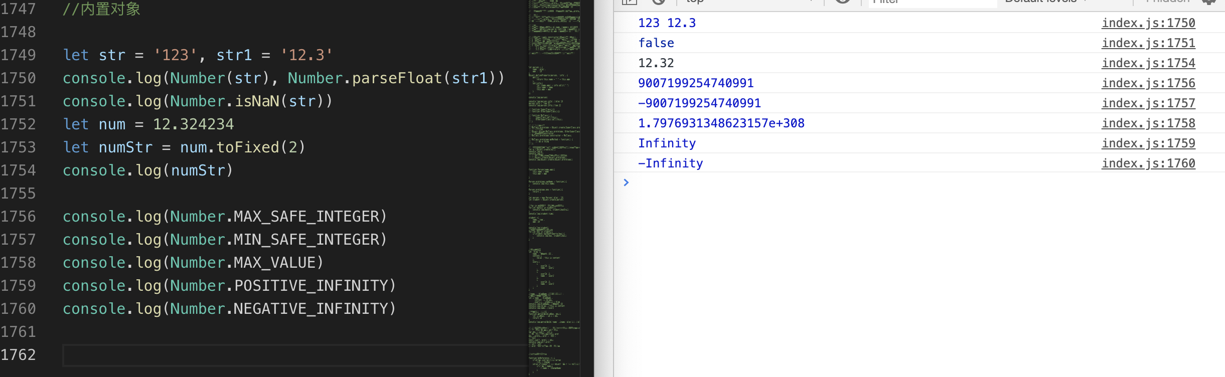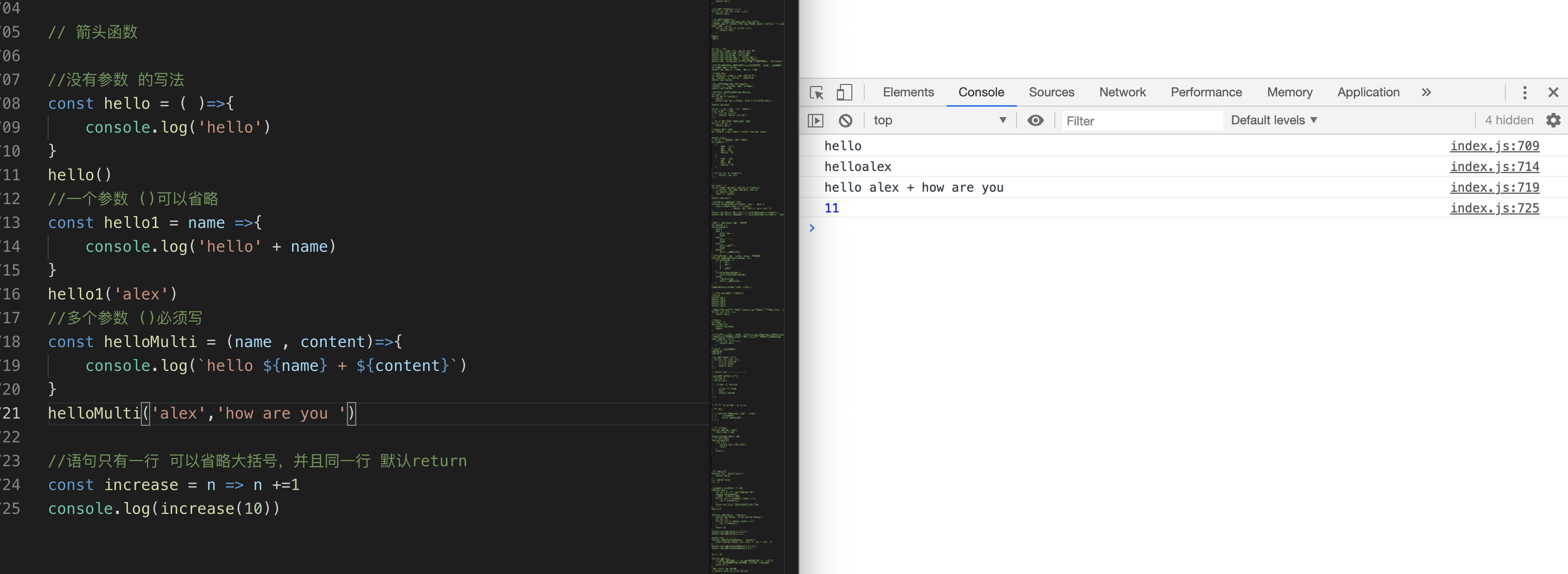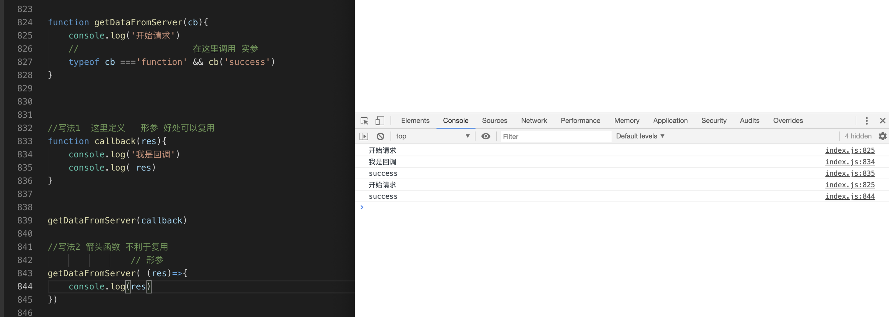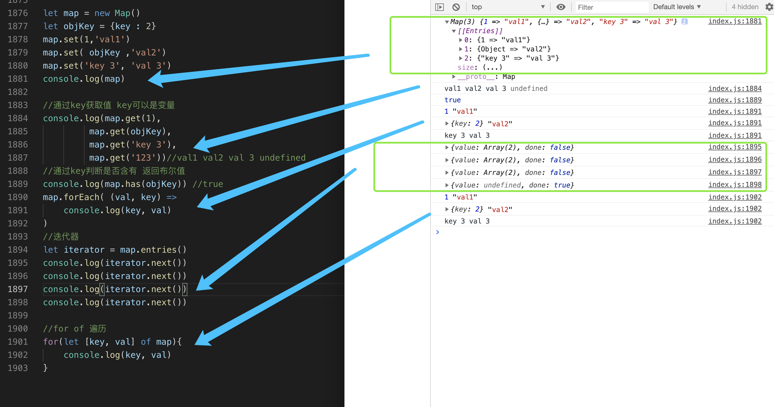 接下来我们就在index.js里面输入新的学到的语法,保存以后,借助live server插件在浏览器里面验证结果