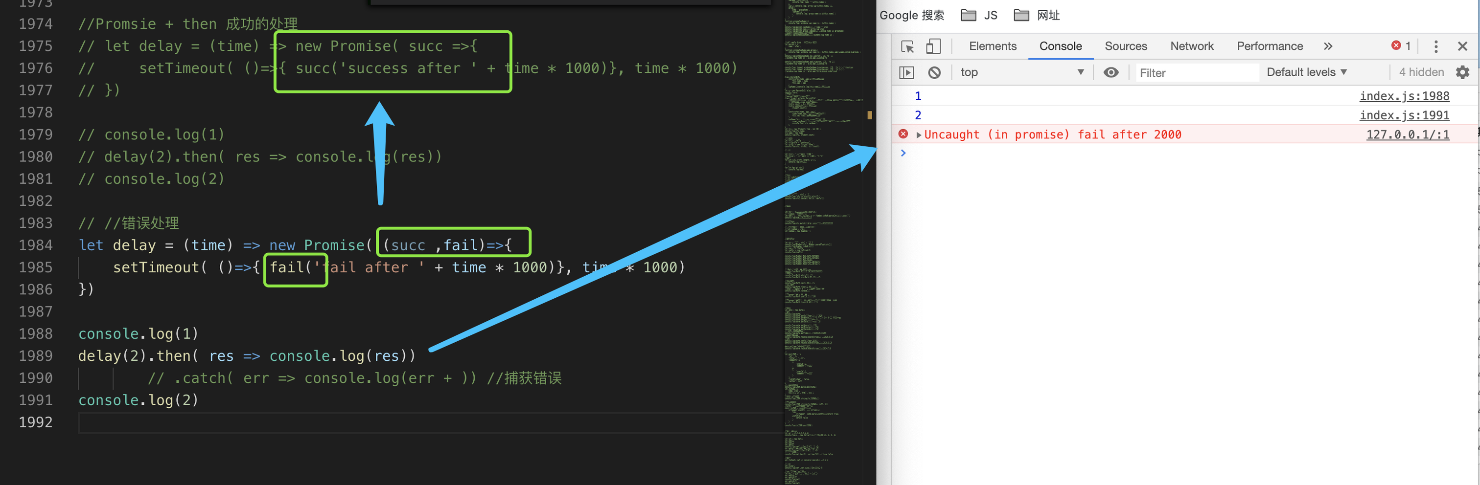 // reject('reject in 1')//捕捉 promsie里面的错误