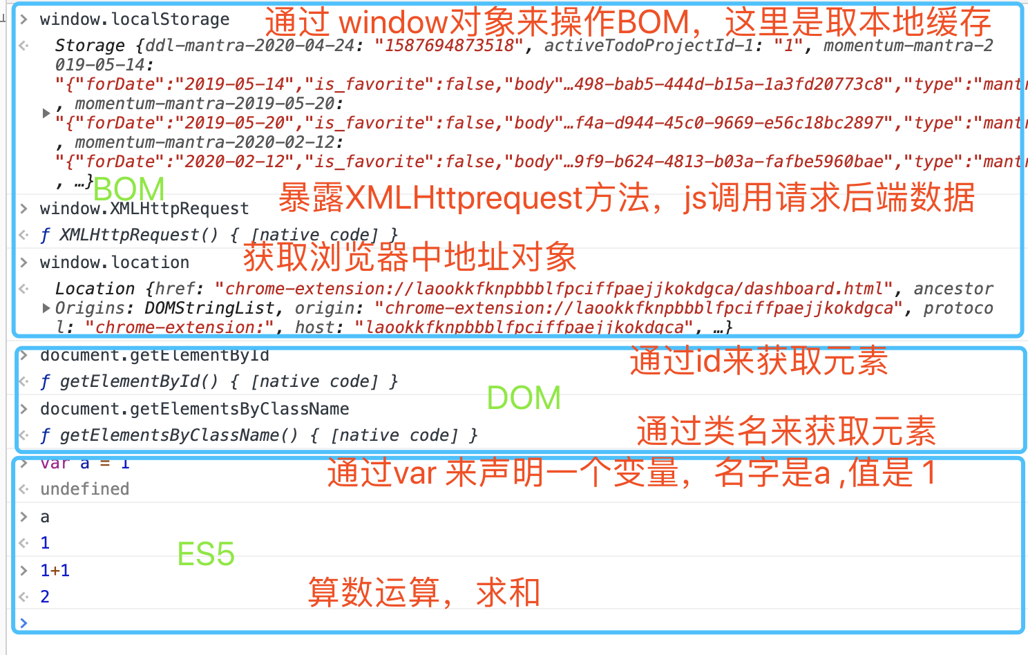 - 操作BOM: 页面的导航,h5的定位api等等都通过这个对象得到