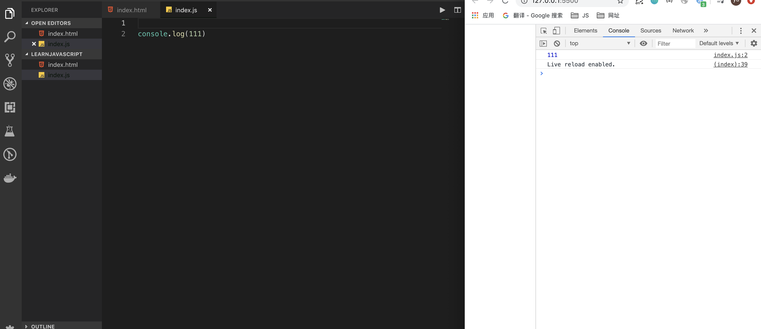 LEARNJAVASCRIPT目录下新建index.js里面输入console.log(111)然后index..html改成这样,表示indx.html中引入index.js,看起来是这样: