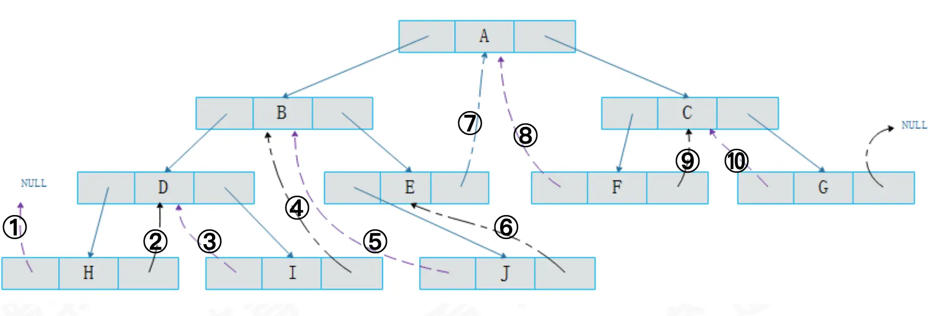 结合图形,可以看出,在第一次打印H之后,进入第二个循环,判断当前结点是否有后继且后继不是头结点,此时判断成立就是进入循环打印D,D不符合条件跳出循环,执行p = p->rightChild会将当前结点变成I,依次类推。