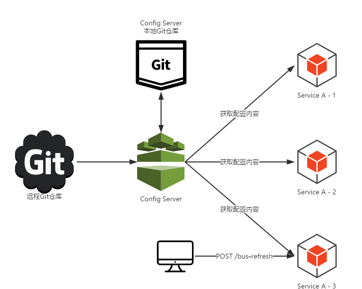 Spring Cloud Config 在微服务分布式系统中,采用 「Server 服务端」和 「Client 客户端」的方式来提供可扩展的配置服务。服务端提供配置文件的存储,以接口的形式将配置文件的内容提供出去;客户端通过接口获取数据、并依据此数据初始化自己的应用。