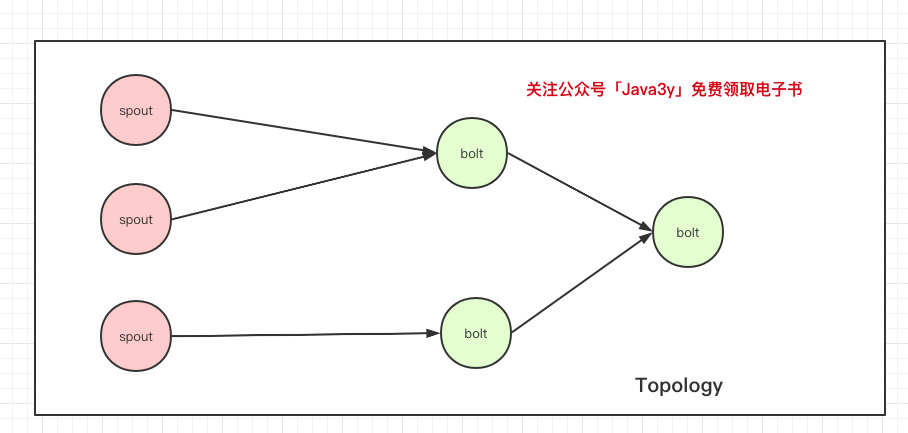 Topology关联了我们在程序中定义好的Spout和Bolt。各种 Spout 和 Bolt 连接在一起之后,就成了一个 Topology,一个 Topology 就是一个 Storm 应用。