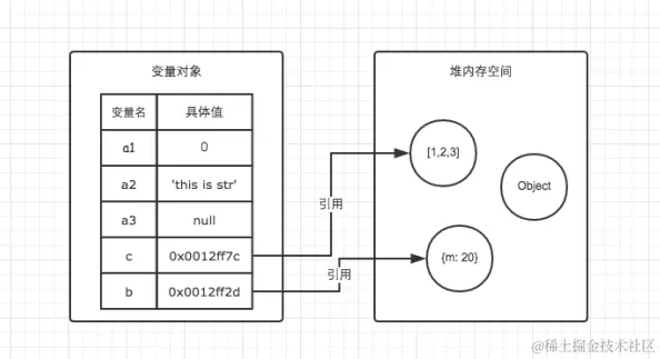 与其他语言不同,JS的引用数据类型,比如数组Array,它们值的大小是不固定的。引用数据类型的值是保存在堆内存中的对象。JavaScript不允许直接访问堆内存中的位置,因此我们不能直接操作对象的堆内存空间。在操作对象时,实际上是在操作对象的引用而不是实际的对象。因此,引用类型的值都是按引用访问的。这里的引用,我们可以粗浅地理解为保存在变量对象中的一个地址,该地址与堆内存的实际值相关联。