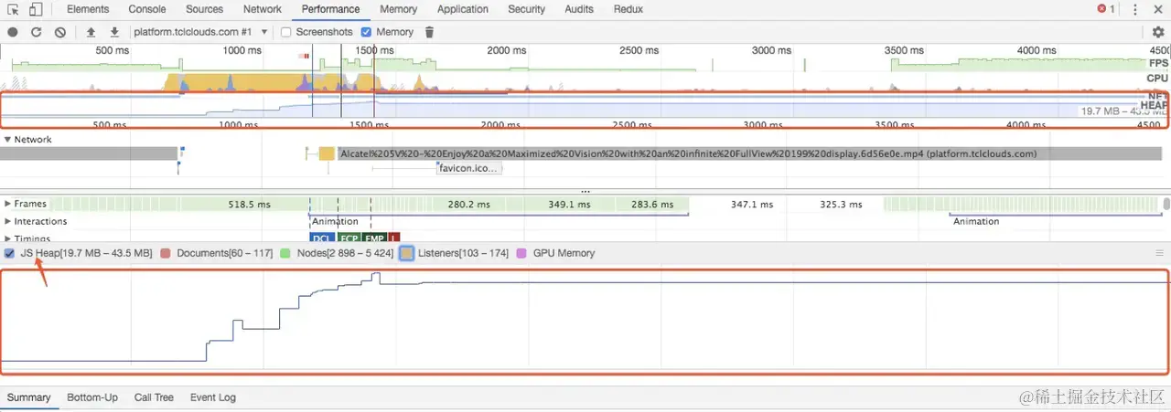- 一段时间后,点击左上角的 stop 按钮,面板上就会显示这段时间的内存占用情况。