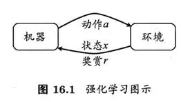 强化学习通常用马尔可夫决策过程(Markov Decision Process, MDP)表示; 环境E, 状态空间X,动作空间A,状态x经动作a后由转移函数P转移到另一个状态x’;在状态转移的同时,环境会根据反馈函数R给机器一个奖赏r。即强化学习任务对应四元组E=<X,A,P,R>。强化学习的原理图如下: