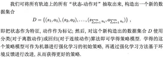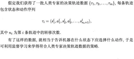 很多强化学习的“状态-动作对”搜索空间巨大,基于累积奖赏来学习很多步之前的合适决策非常困难,更好的办法是直接模仿人类专家的“状态-动作对”选择,这被称为“直接模仿学习”。