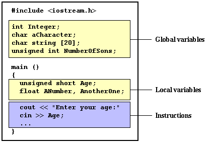 如果以上程序中变量声明部分有你不熟悉的地方,不用担心,我们在后面的章节中很快会学到这些内容。 变量的范围(Scope of variables) 所有我们要使用的变量都必须事先声明过。C和C++语言的一个重要区别是,在C++语言中我们可以在源程序中任何地方声明变量,甚至可以在两个可执行(excutable)语句的中间声明变量,而不象在C语言中变量声明只能在程序的开头部分。然而,我们还是建议在一定程度上遵循C语言的习惯来声明变量,因为将变量声明放在一处对debug程序有好处。因此,传统的C语言方式的变量声明就是把变量声明放在每一个函数(function)的开头(对本地变量local variable)或直接放在程序开头所有函数(function)的外面(对全局变量global variable)。 一个变量可以是本地(local)范围内有效,叫做本地变量,也可以是全局(global)范围内有效,叫做全局变量。全局变量要定义在一个源码文件的主体中,所有函数(包括主函数main())之外。而本地变量定义在一个函数甚至只是一个语句块单元中。如下图所示: