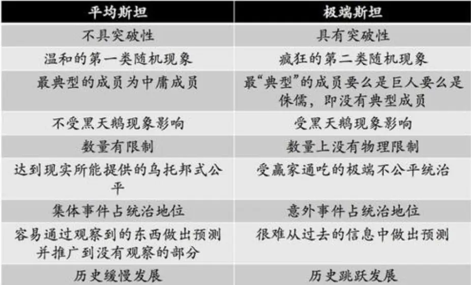 历史是由平均斯坦和极端斯坦构成的。但世界是由极端斯坦、未知和非常不可能发生的事物主导的。人类的出现只是十分幸运的一次突变,一次在极端斯坦的环境中侥幸出现并存活下来的。现在的人们习惯了在平均斯坦的生活方式,将平均斯坦的生活方式和思维习惯带到了极端斯坦中而又全然不知。