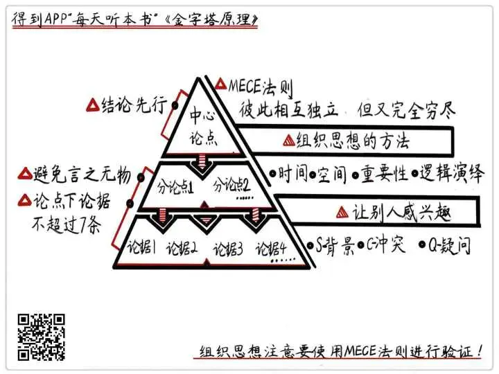 - 自下而上:列出你想表达的所有思想要点,找出各个要点间的逻辑关系,得出结论。