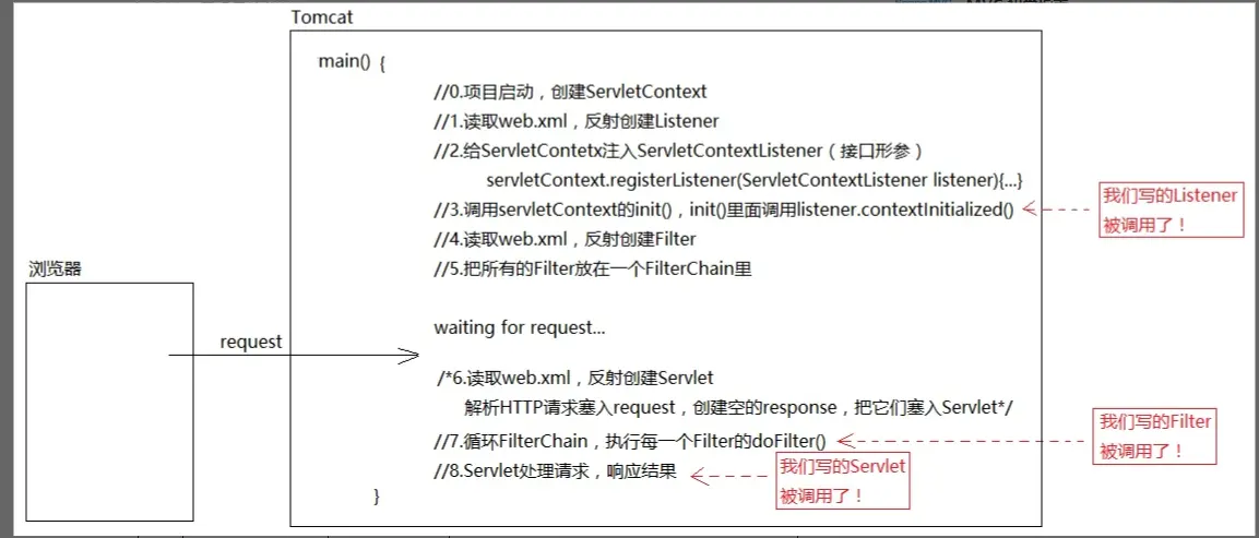 当我们使用到Tomcat后,就不再需要写main方法,也不再需要new一个类,Tomcat通过web.xml将这些事情做完,