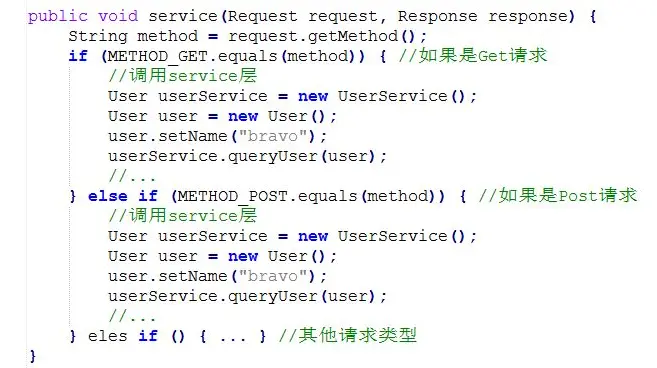 浏览器发送请求有多种方式,最基本的是Get/Post,如果单单通过继承Servlet来编写逻辑代码,那么就需要根据不同的请求来编写代码。