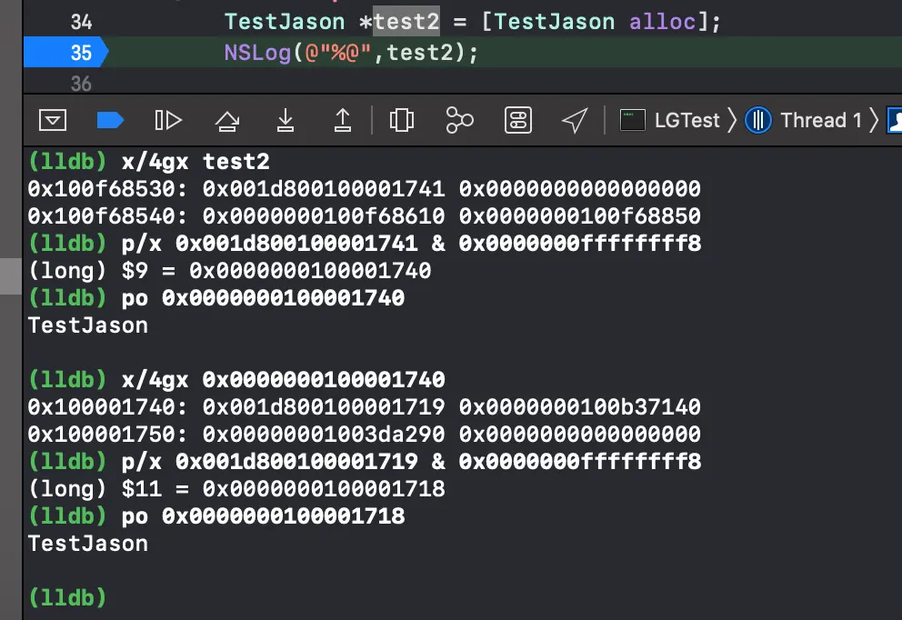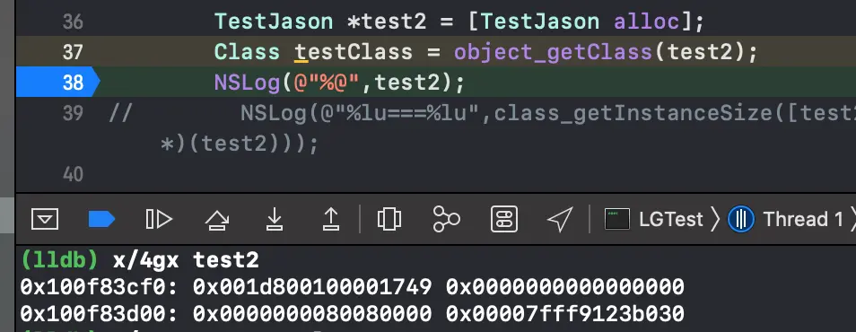 下面就是用lldb的指令来验证一下的。首先用x/4gx test2来打印出地址