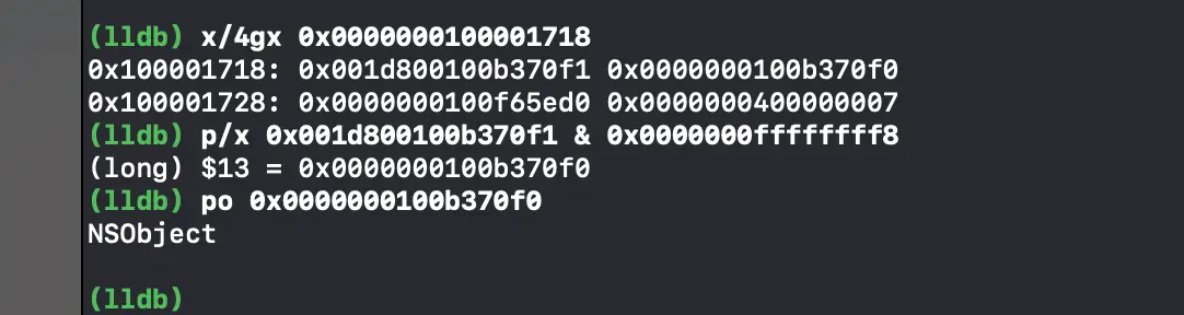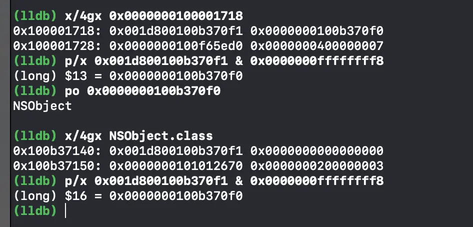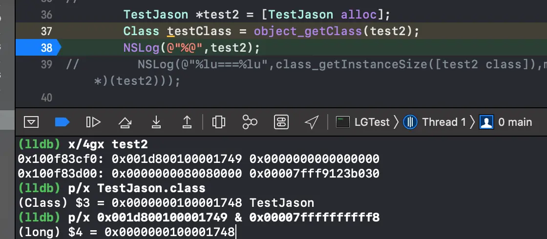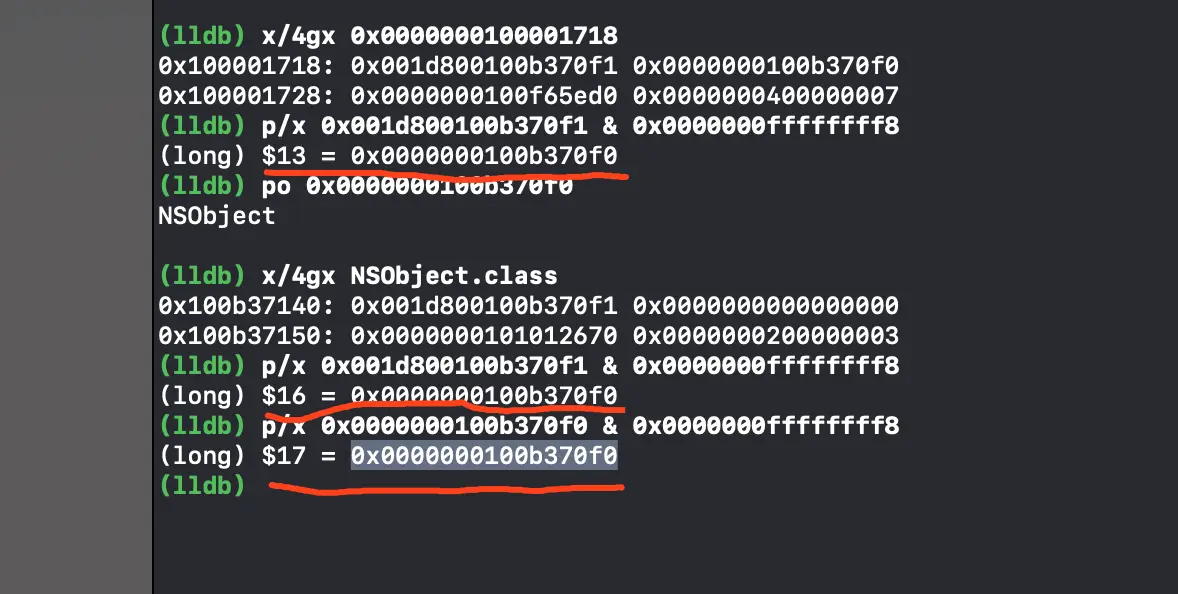 (Class)(isa.bits & ISA_MASK)的,所以将x/4gx test2打印出来的0x001d800100001749 & ISA_MASK的值得到如下: