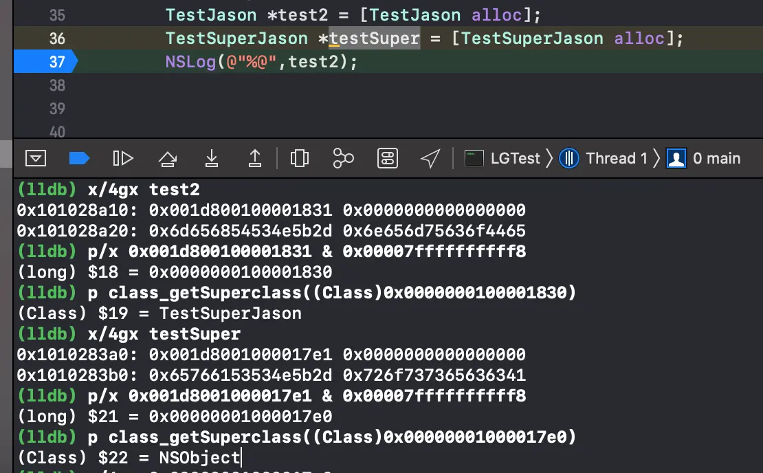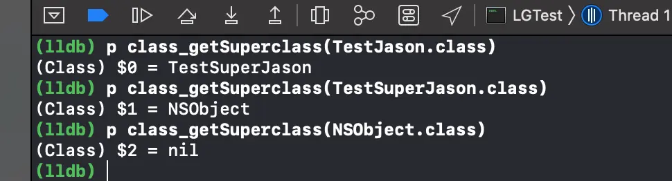 为了介绍方便,添加多一个TestSuperJason的类,并且让TestJason是继承TestSuperJason的。还是通过lldb的指令来的打印class_getSuperclass方法。