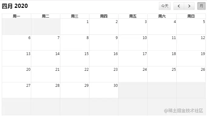不出意外配置到这里fullcalendar就会变为下图,接下来开始配置数据源