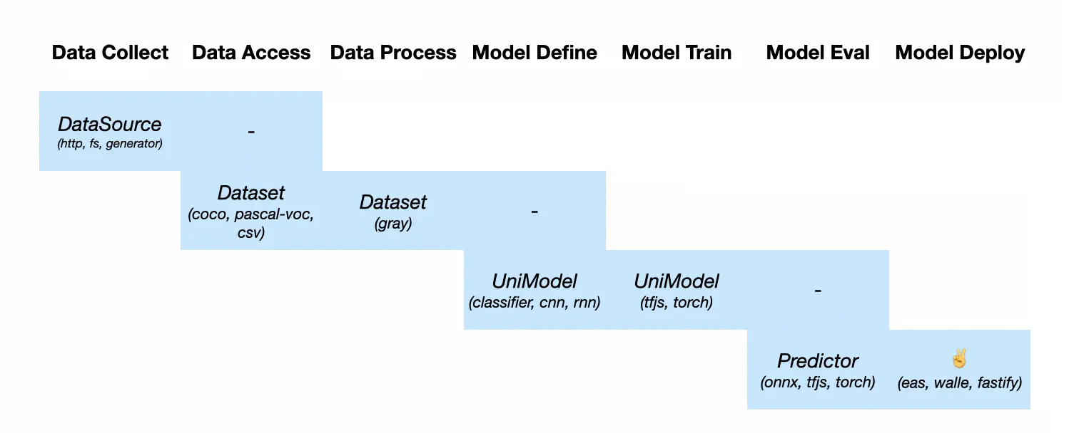 因此在 Pipcook 正式发布 1.0 版本时,我们引入了一个叫 MLApp 的概念,即——机器学习应用框架,它跟 Vue、React、Angular 一样,就是帮助我们完成应用开发的,只不过它面向的是机器学习的应用。