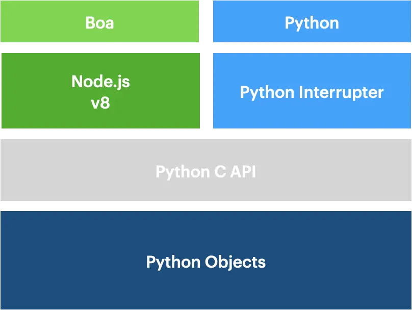 上面的图就是为了说明这个问题而画的。无论对于 Boa 还是 Python 来说,最下面一层都是 Python Objects,这里包含了 Python 中所有函数的定义、变量的定义以及操作符的定义等等,然后对于 Python 代码来说,就是通过它自己的解释器将 Python 代码转换成对 Python Objects C API 的调用。