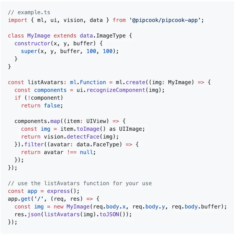 在 MLApp 中,我们通过 TypeScript 的类型系统,为每个涉及到机器学习的模块都声明了 ml.Function 类型,并通过 ml.create(fn) 函数创建,然后在创建的时候,可以在 fn 中使用机器学习的 API,最后只需要在任何的 Node.js 函数中调用创建的函数就可以了。