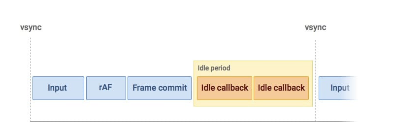 requestIdleCallback(callback, { timeout: number })是浏览器提供的一种可以让回调函数执行在每帧(上图2个vsync之间即为1帧)末尾的空闲阶段的方法,配置timeout后,若多帧持续没有空闲时间,超过timeout时长后,该回调函数将立即被执行。
