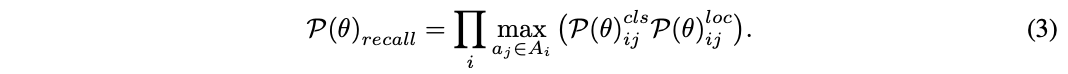 为了学习anchor和GT的匹配关系,先将目标检测算法的训练转换为最大似然估计过程,从最大似然地角度优化分类和检测,然后定义检测定制似然,通过保证召回率和准确率进行匹配关系的优化,在训练阶段,将检测定制似然转换为检测定制损失,有效地端到端同时学习目标分类、目标检测以及匹配关系。