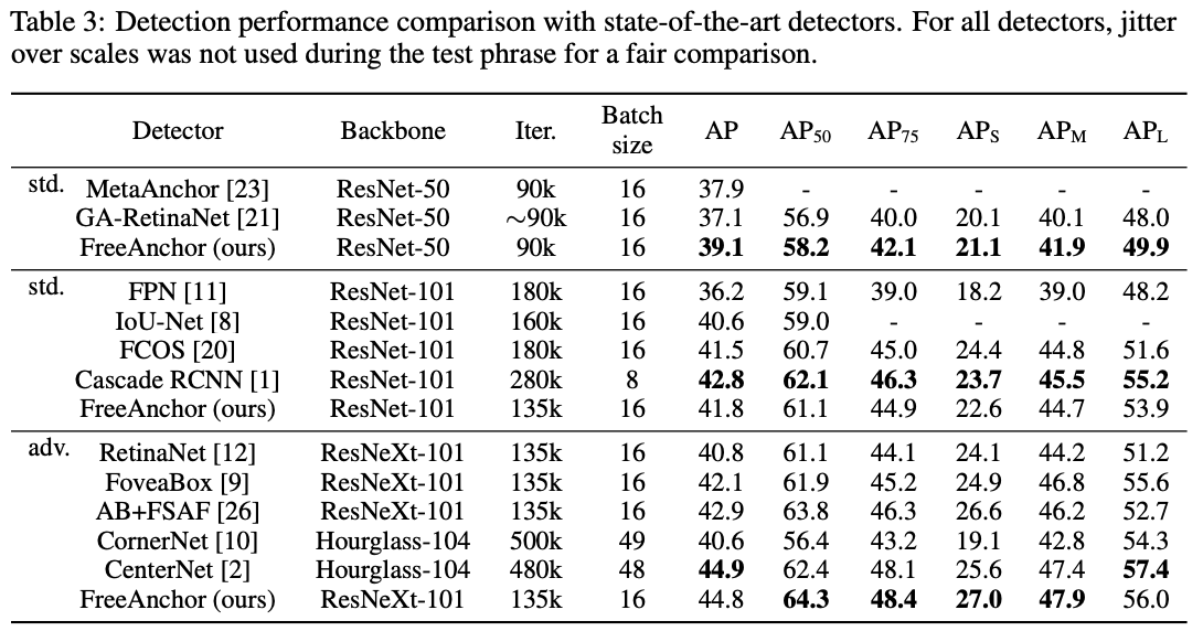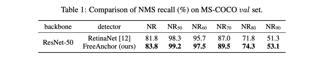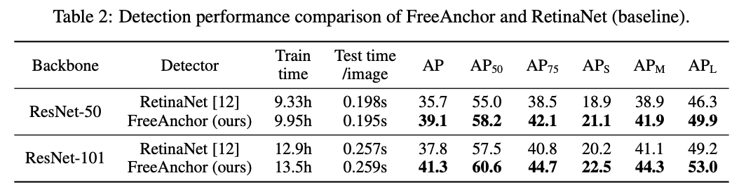 实验的FreeAnchor实现基于RetinaNet,简单地将损失函数修改为论文提出的检测定制损失函数。