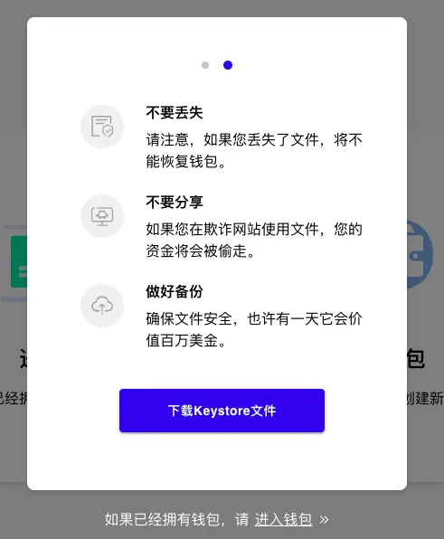 Keystore文件, 并设置钱包密码Keystore文件, 输入钱包密码创建新的钱包,时请务必仔细阅读下面的文字
