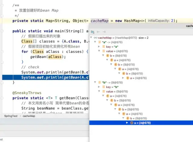 这段代码的效果,其实就是处理了循环依赖,并且处理完成后,cacheMap中放的就是完整的“Bean”了