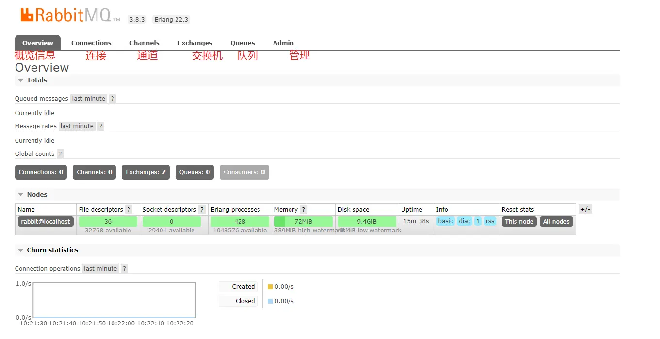 可登陆管理控制台,同时可以查看rabbitmq节点的相关信息(进程数,内存使用情况,磁盘使用情况等)