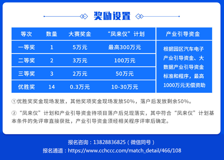 大赛共设20个获奖名额,其中单个项目有机会获得“大赛奖金+‘凤来仪’计划+产业引导资金”最高1305万元赛事奖励。