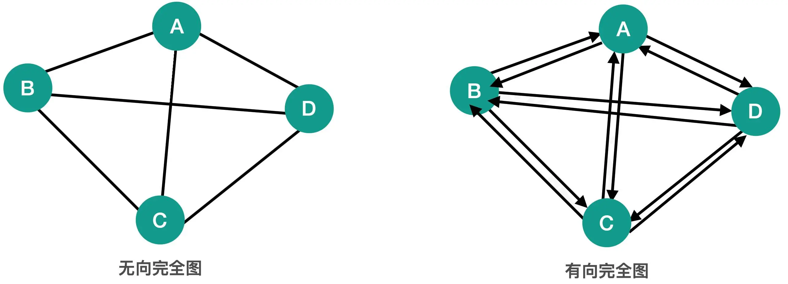 完全图:若图中各个顶点都与除自身外的其他顶点有关系,这样的无向图称为完全图,同时,满足此条件的有向图则称为有向完全图