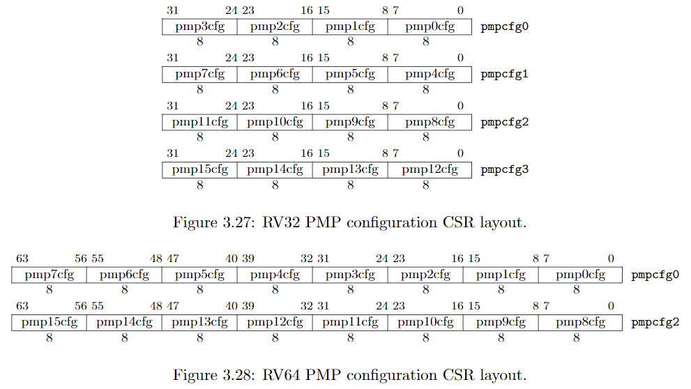 对于RV32,将4个8bit配置寄存器放到一个32bit CSR寄存器中,对于RV64,每个真实寄存器中则保存了8个配置寄存器的信息。这些真实寄存器的名字即pmpcf0~pmpcf3