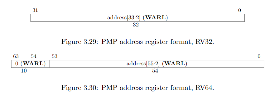 在RISC-V设计的Sv32分页虚拟内存模式下,RV32拥有34位物理地址空间,故对于RV32来说,PMP必须支持34位的物理内存访问管理。故在32位地址寄存器中,保存33~2位的地址数据。而对于RV64,保存第55~2位,如下图: