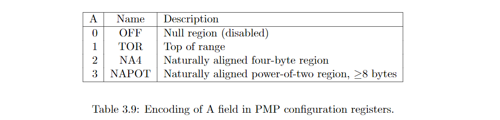 之前说明了,一个PMP entry由一个地址寄存器和一个配置寄存器组成。那么,如何知道该PMP entry控制的物理地址范围呢?这是由配置寄存器中的A字段和地址寄存器共同决定的。