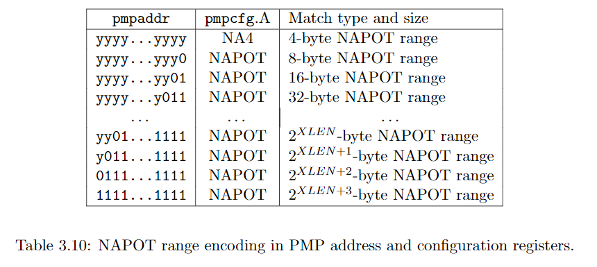考虑一种边界情况,若pmpaddr值为yyyy...yyyy,此时控制的地址范围即是从yyyy...yyyy开始的4个字节,而pmpcfg.A的值为NA4,即Naturally Aligned Four-byte regions.