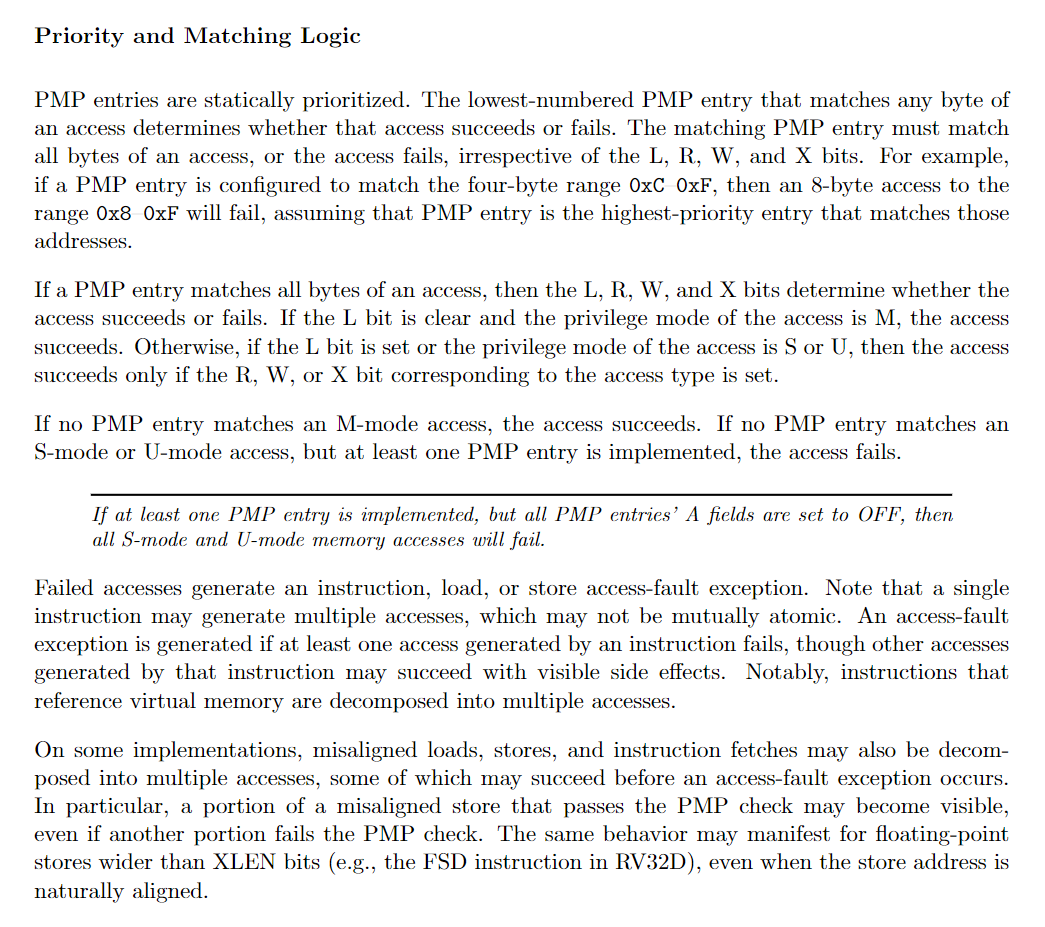 特别的,若第0个PMP entry的A字段为TOR,其所控制的地址空间的下界被认为是0,即匹配所有满足如下条件的地址: