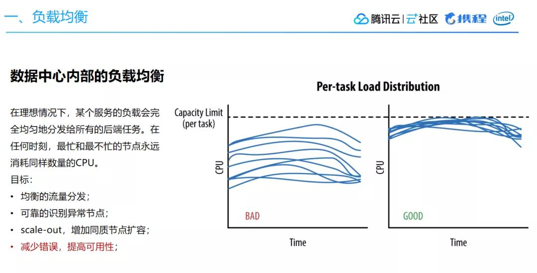 数据中心内部的负载均衡方面,理想情况下会像上图右边显示那样,最忙和最不忙的节点所消耗的CPU相差幅度较小。但如果负载均衡没做好,情况可能就像上图左边一样相差甚远。由此可能导致资源调度、编排的困难,无法合理分配容器资源。