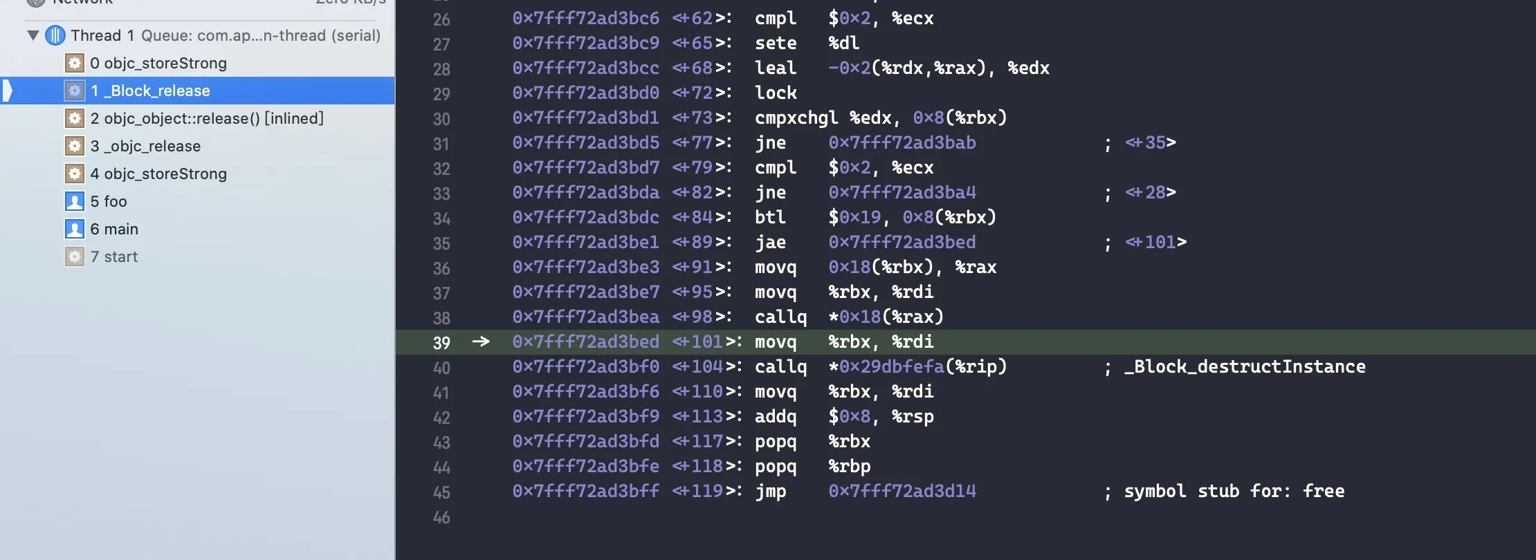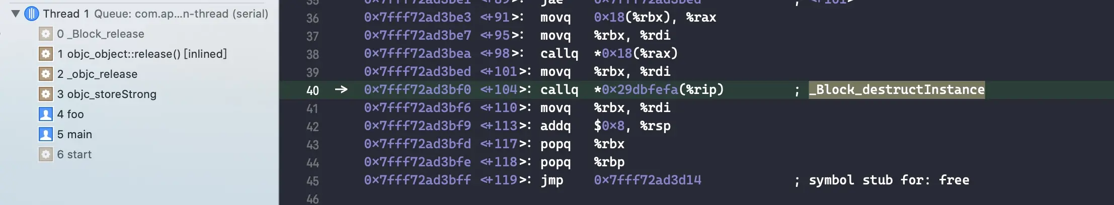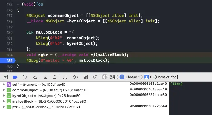 创建一个 malloc block 类型的 block,foo() 结束,block 会被回收。 在函数尾巴那里打个断点
