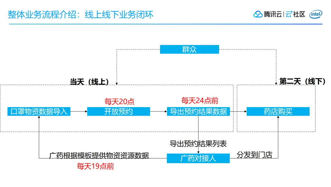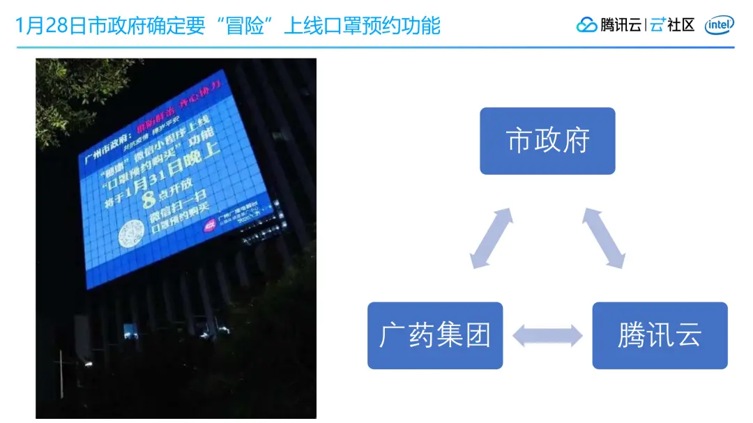其次,相对于之前第1版上线的三个功能而言,口罩预约功能的业务逻辑更加复杂。这个项目是由市政府去主导,腾讯负责产品研发,广药集团负责口罩物资的提供、调配、以及线上线下的业务运营。