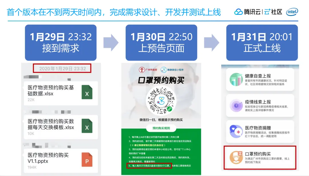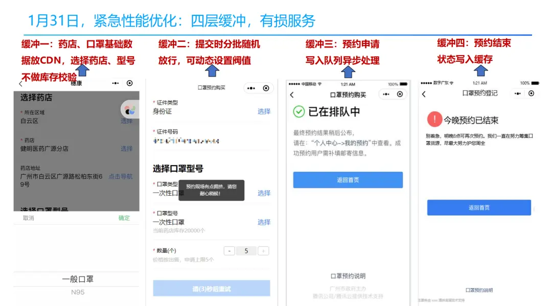 在战“疫”期间,腾讯与广州市政府合作,在2天内上线了“穗康”小程序口罩预约功能,解决了购买口罩难的问题,上线首日访问量1.7亿,累计参与口罩预约人次1400万+。本文是腾讯云专家产品经理 汤文亮老师在「云加社区沙龙online」分享整理,为大家揭晓其前后端架构及产品设计。