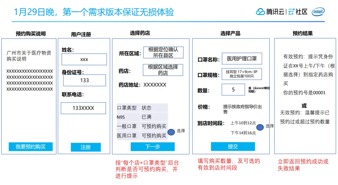 这就是我们收到的第1个需求版本,可以称得上是一个相对完美的无损体验版本。用户进来首先看到的是购买说明,然后进行注册,可以自动定位到用户当前所在区域,选择对应药店,同时会显示当前药店各个型号口罩的库存状态,进行选购预约。
