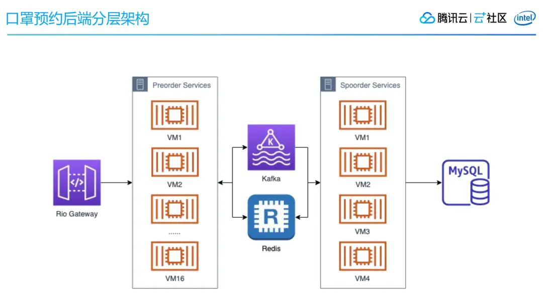 具体来说,在我们的设计里面分了两层,一个是Preorder Servives,另一个是 Spoorder Services。Preorder Servives主要是给前端去做提交预约、登记以及预约查询等服务提供接口。可以避免在超高并发的情况下去查询数据库,而且我们也通过这种分配的技术,将数据分散到不同的分片,后续更容易实现水平的扩容。